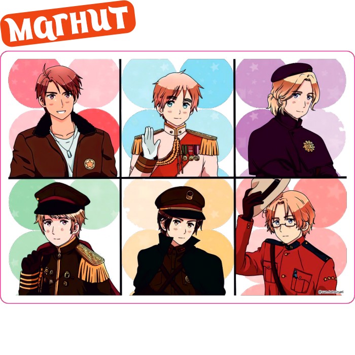 Красивые магниты из акрила с персонажами вселенной «Хеталия и страны Оси» — классический сувенир или подарок, который можно повесить на холодильник, специальную доску или куда-нибудь ещё :)
