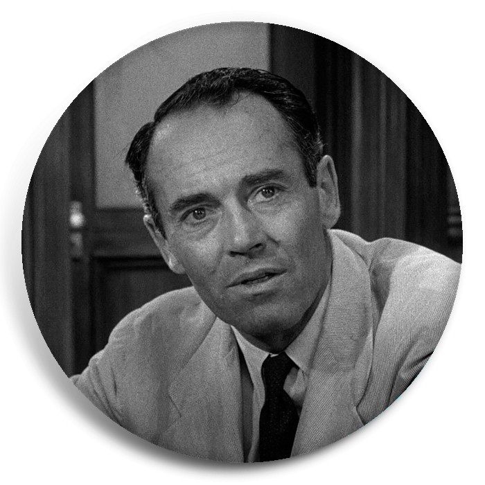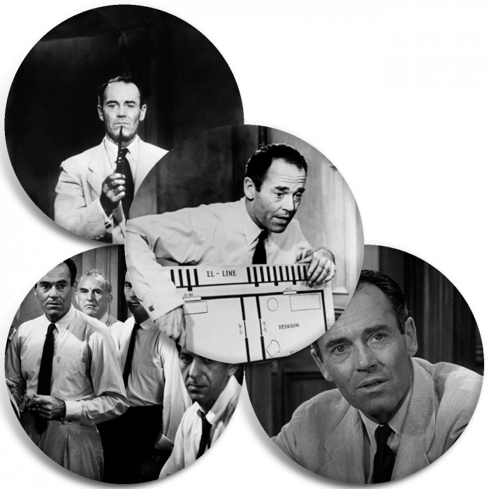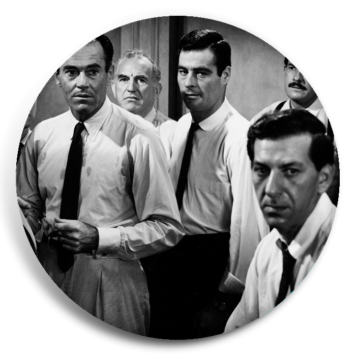 Несколько видов значков с персонажами вселенной 12 разгневанных мужчин.