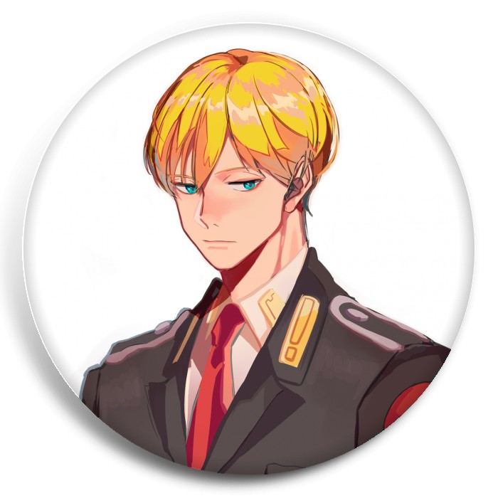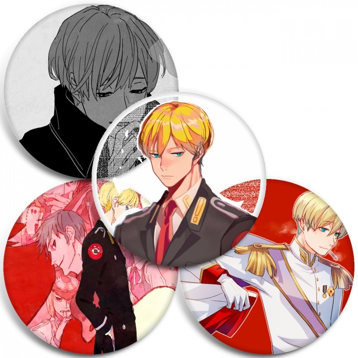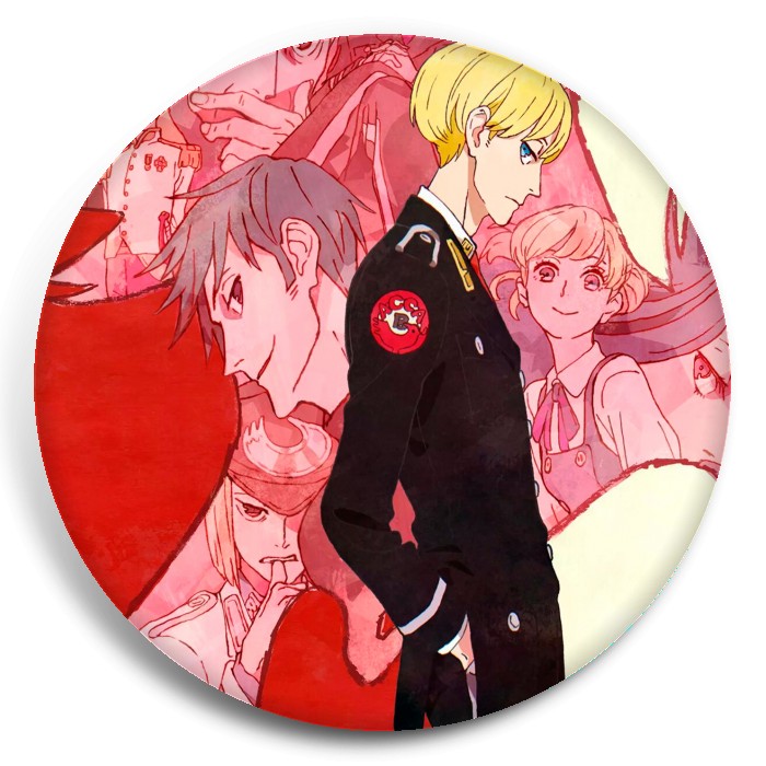 Несколько видов значков с персонажами вселенной АККА: Инспекция по 13 округам.