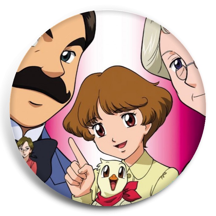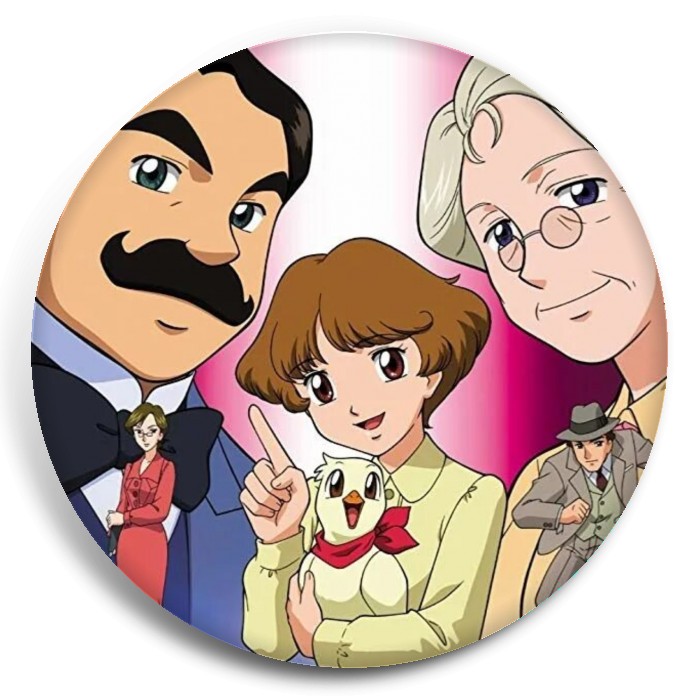 Несколько видов значков с персонажами вселенной Пуаро и Марпл — Великие детективы Агаты Кристи.