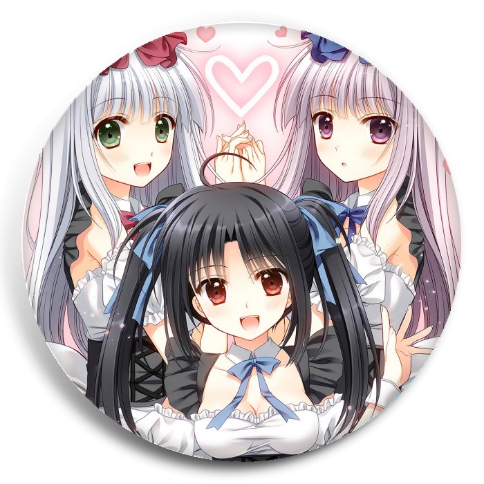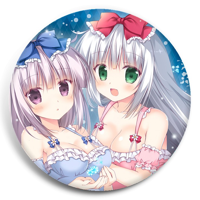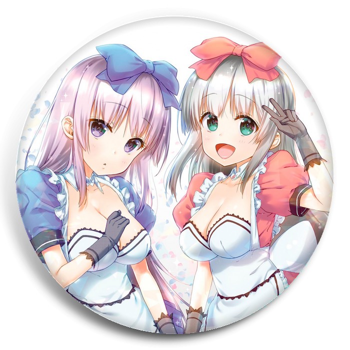 Несколько видов значков с персонажами вселенной Алиса или Алиса: Брат-сисконщик и сёстры-близняшки.