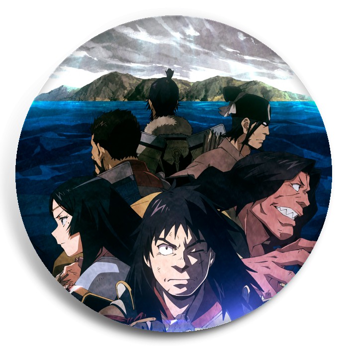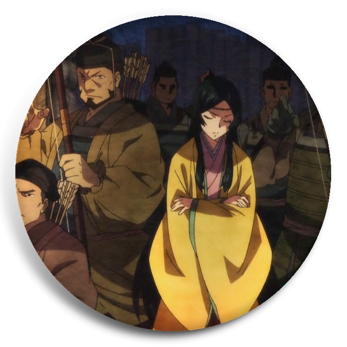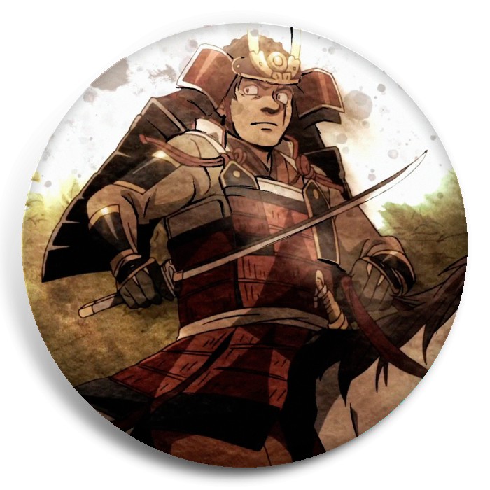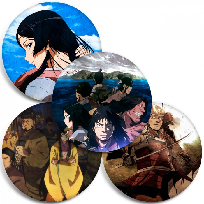 Несколько видов значков с персонажами вселенной Анголмуа: Хроники борьбы с монгольским нашествием.