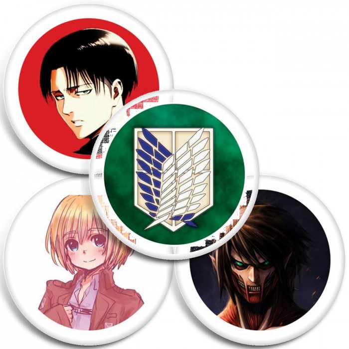 Несколько видов значков с персонажами вселенной Атака титанов.