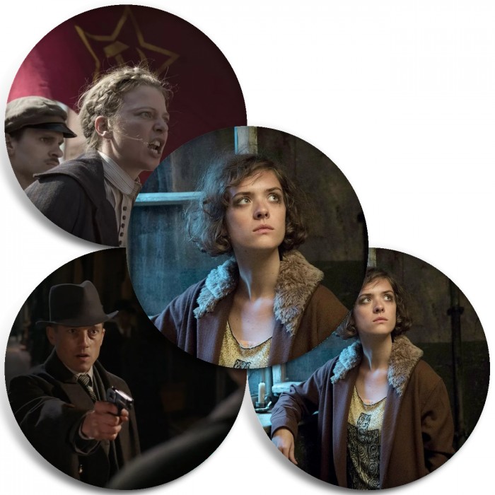 Несколько видов значков с персонажами вселенной Вавилон-Берлин.