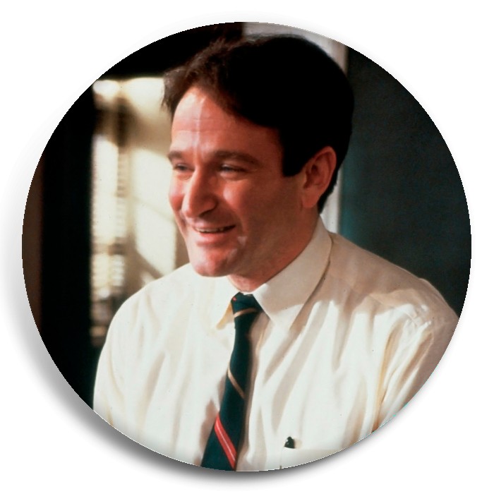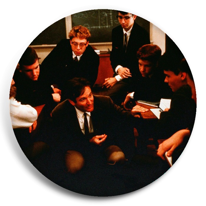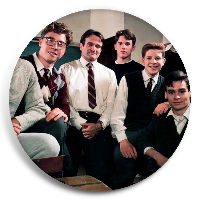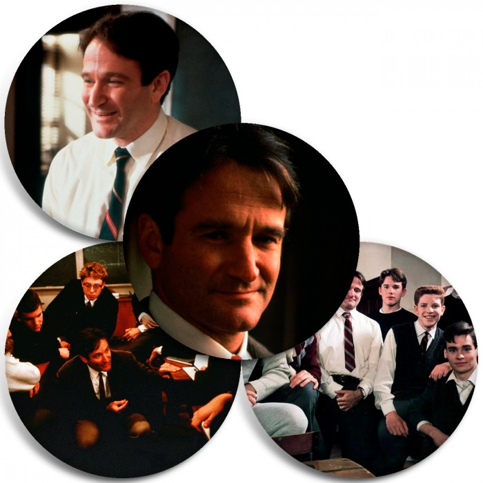 Несколько видов значков с персонажами вселенной Общество мёртвых поэтов.