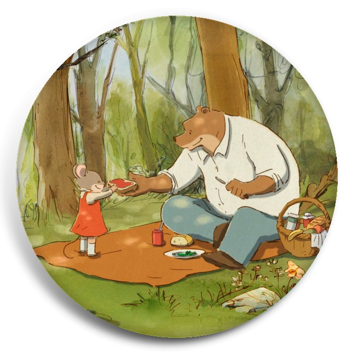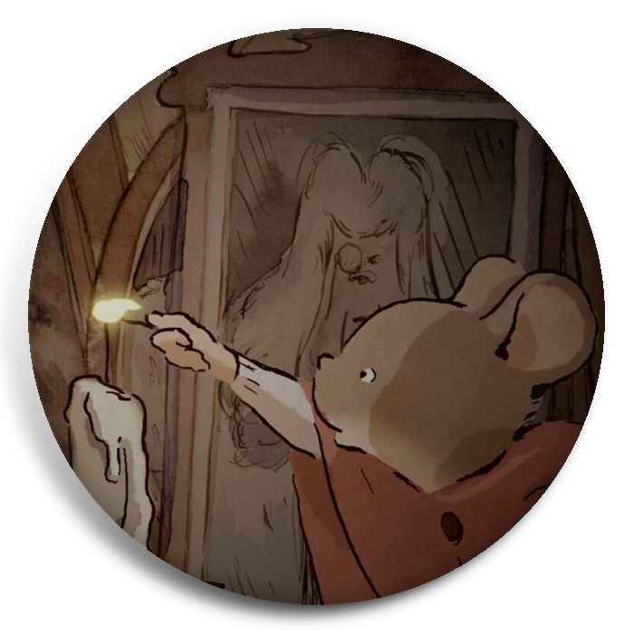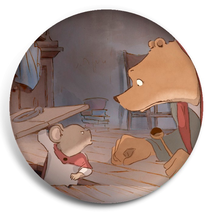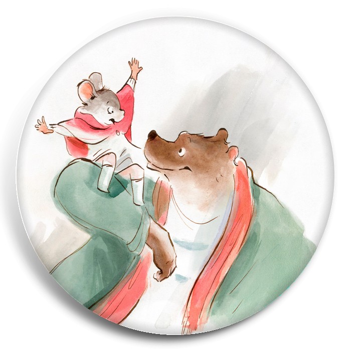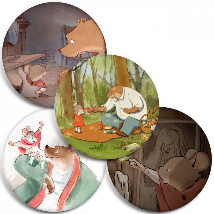Несколько видов значков с персонажами вселенной Эрнест и Селестина: Приключения мышки и медведя.