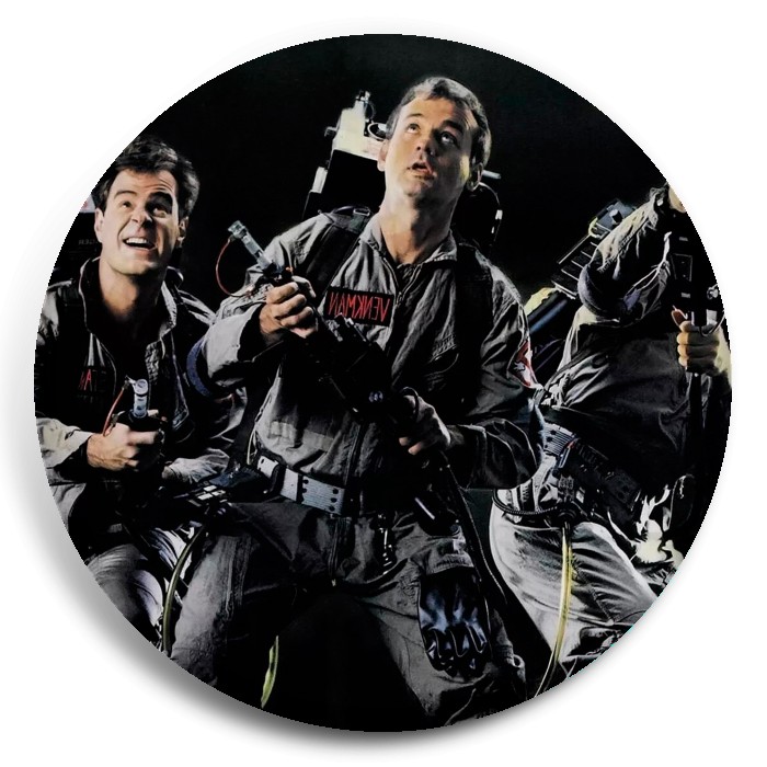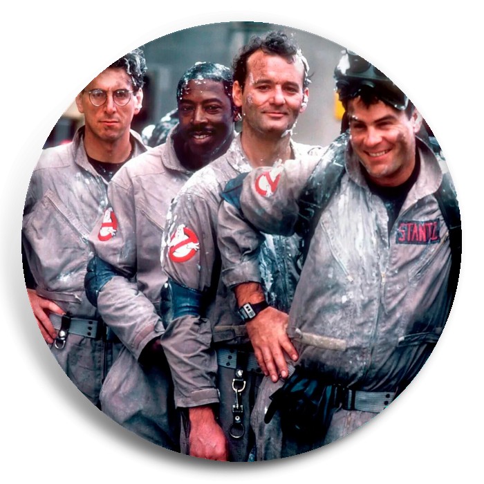 Несколько видов значков с персонажами вселенной Охотники за привидениями.