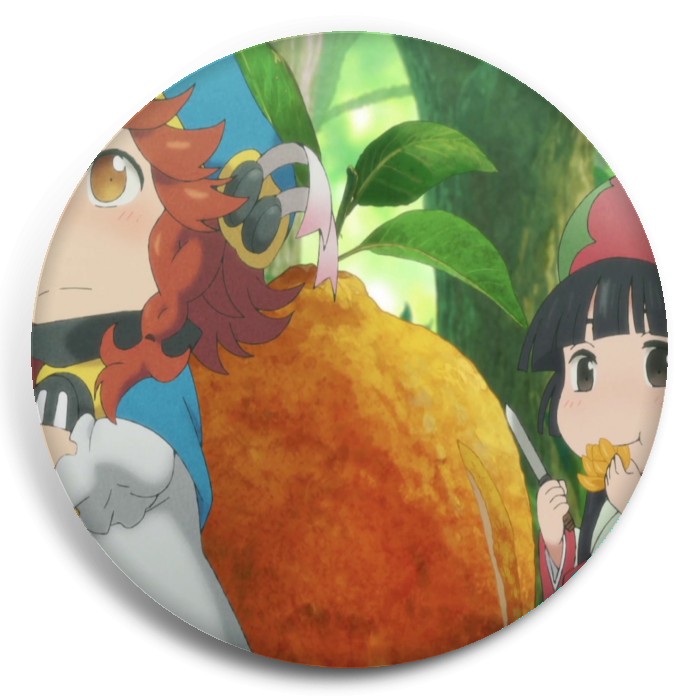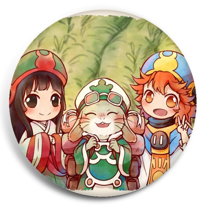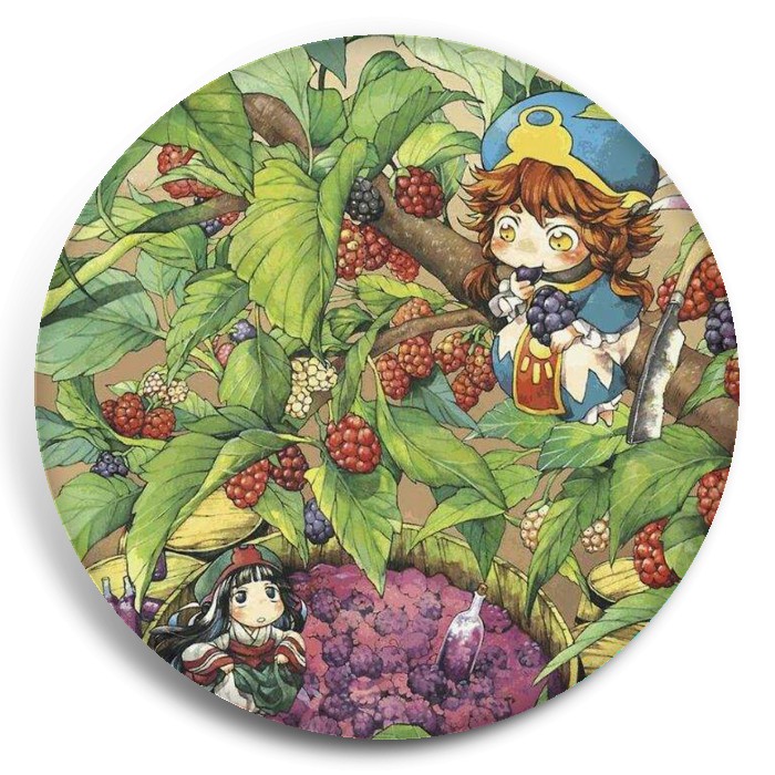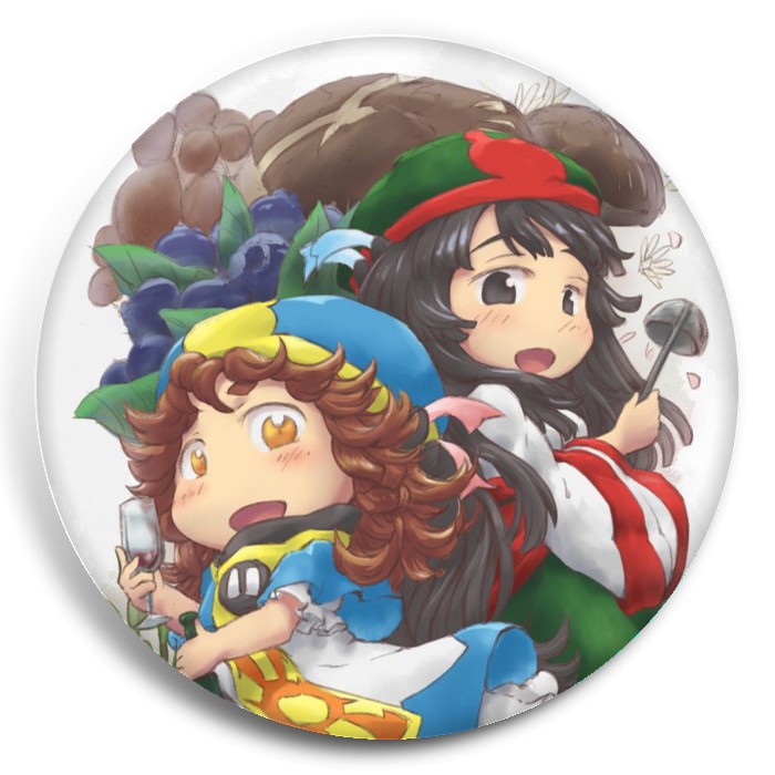 Несколько видов значков с персонажами вселенной Хакумэй и Микоти.