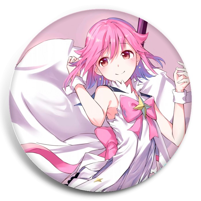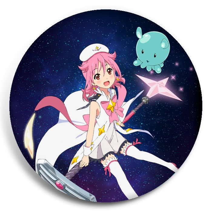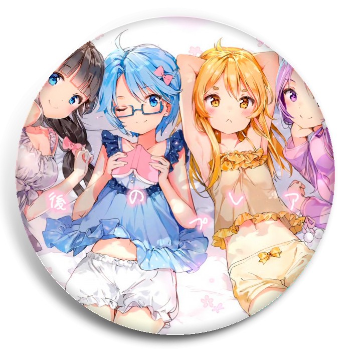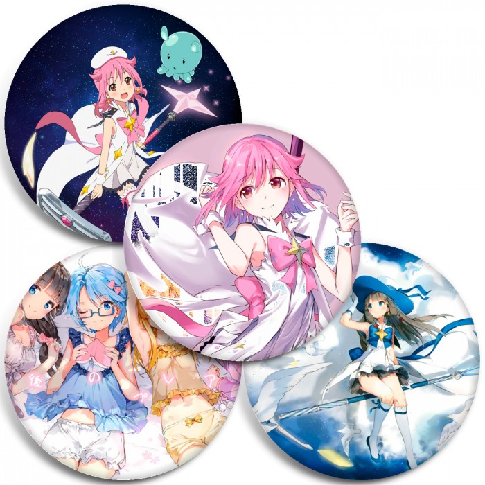Несколько видов значков с персонажами вселенной Внеклассные Плеяды.