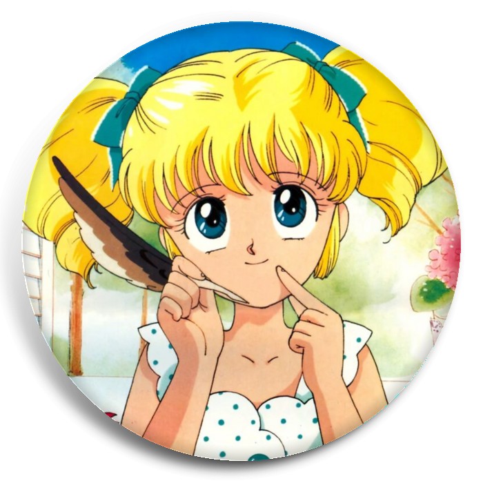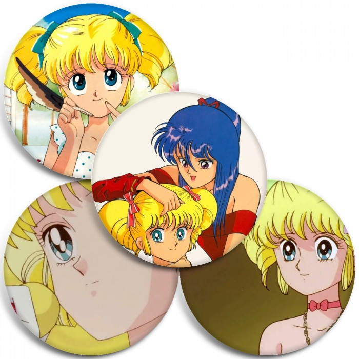 Несколько видов значков с персонажами вселенной Эрико; легендарная поп-звезда.