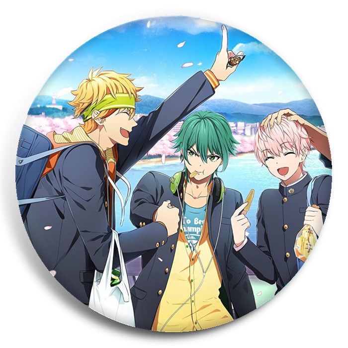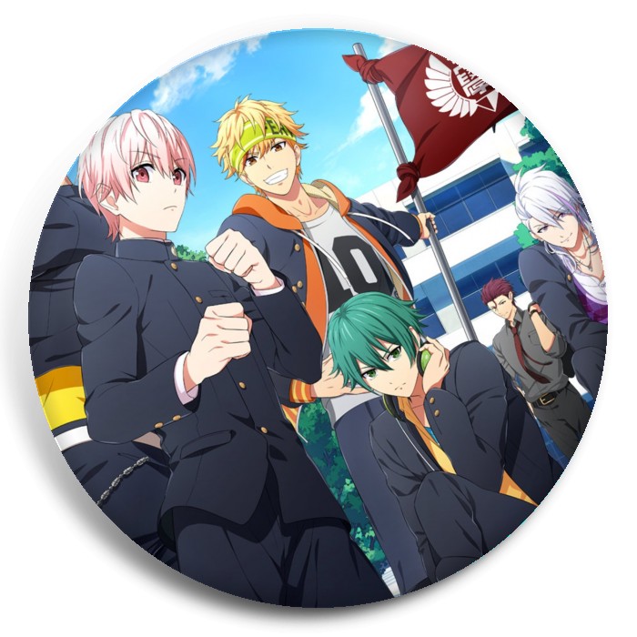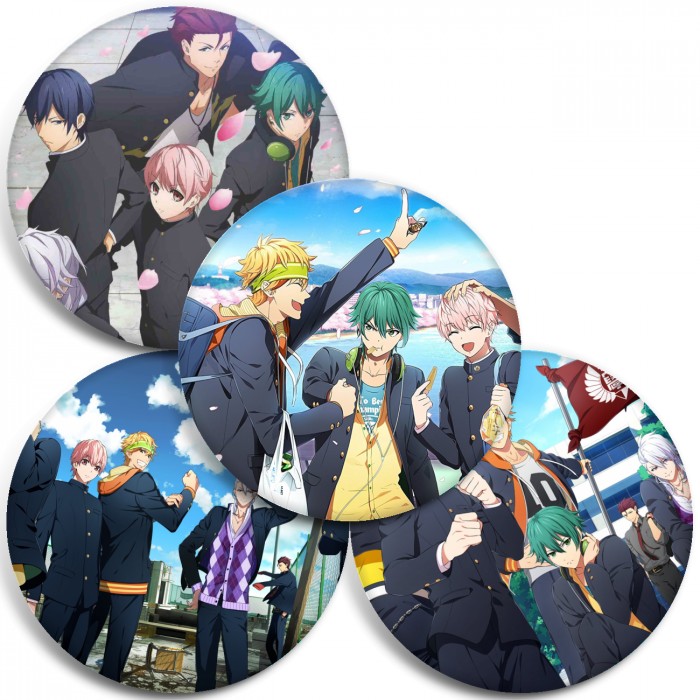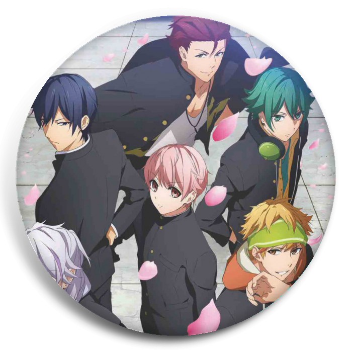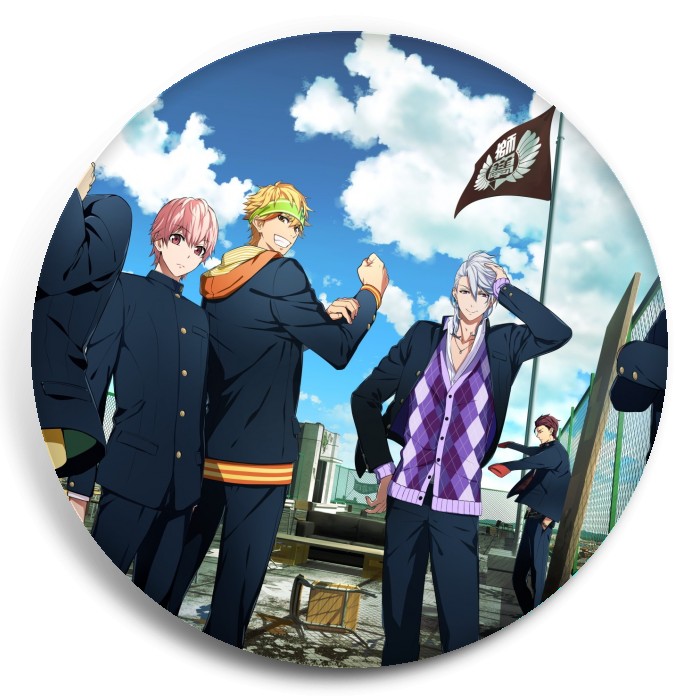 Несколько видов значков с персонажами вселенной Боевой главарь банды: Девушка бьёт парней.