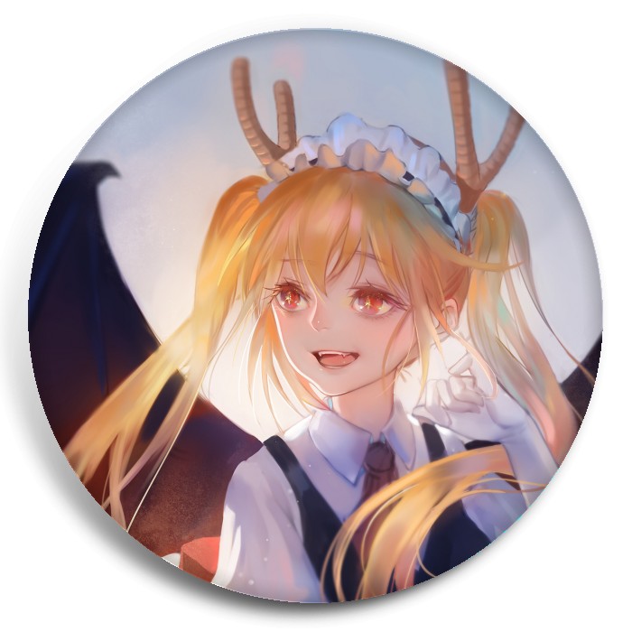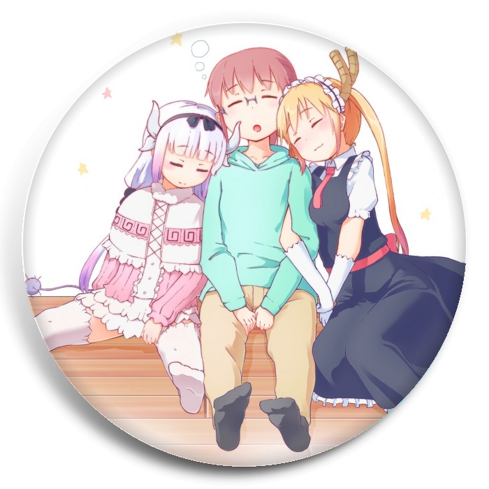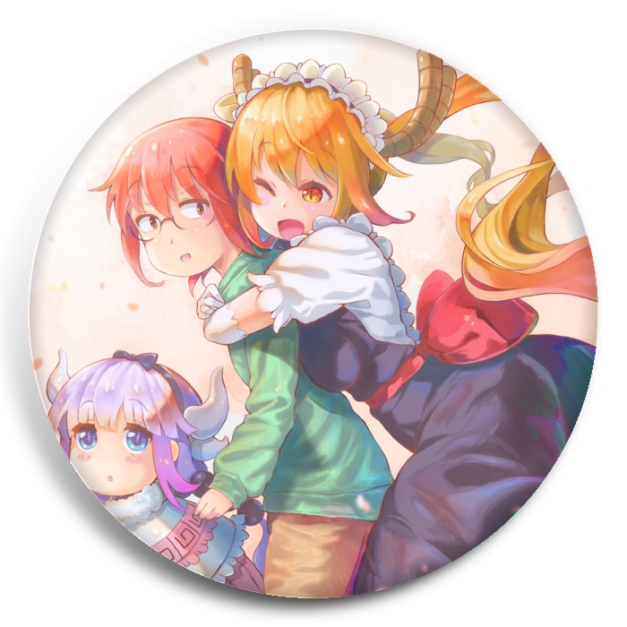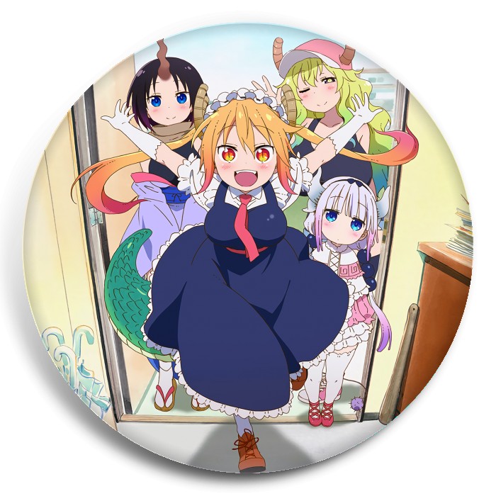 Несколько видов значков с персонажами вселенной Дракон-горничная госпожи Кобояши.