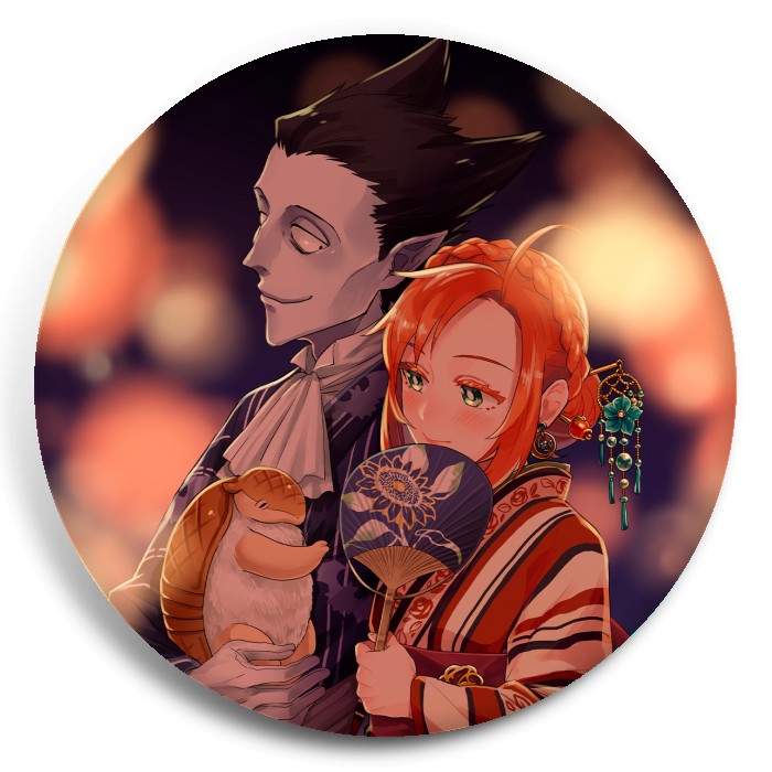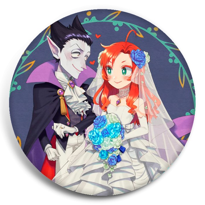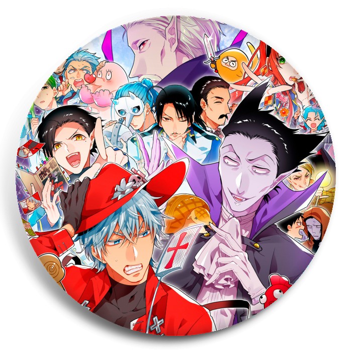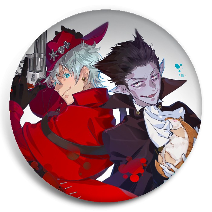 Несколько видов значков с персонажами вселенной Этот вампир постоянно умирает.