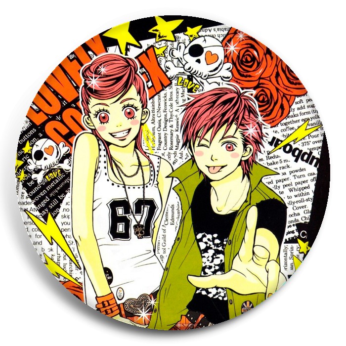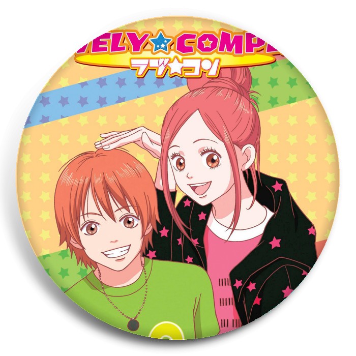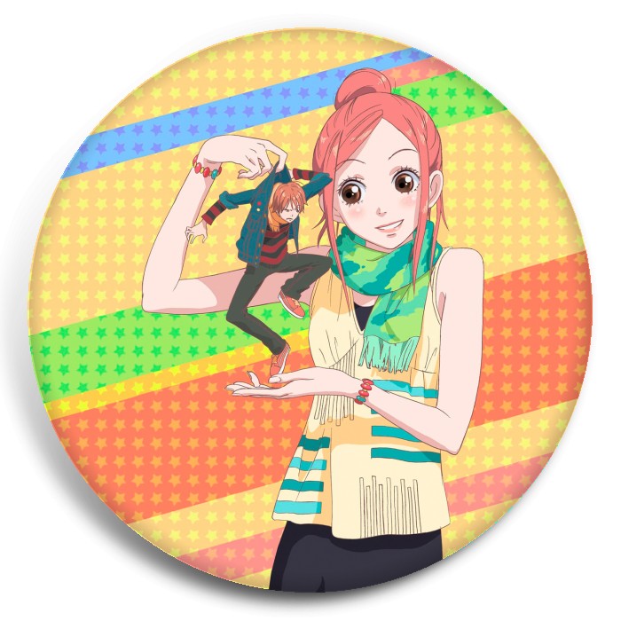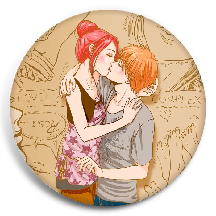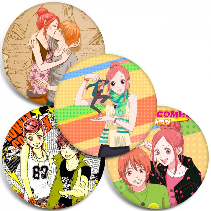 Несколько видов значков с персонажами вселенной Трогательный комплекс.