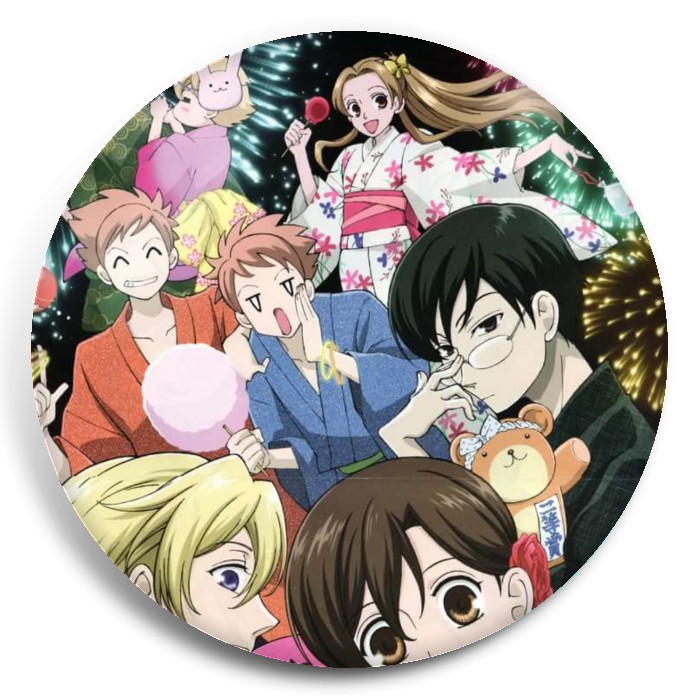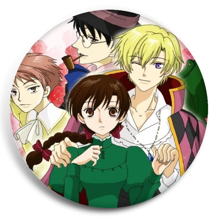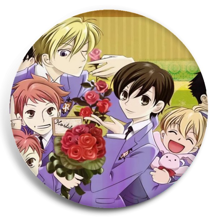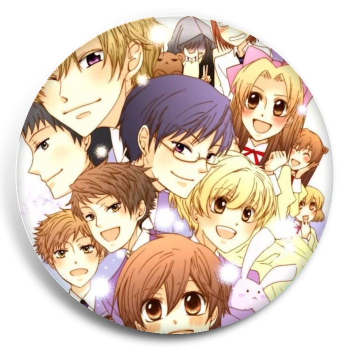 Несколько видов значков с персонажами вселенной Клуб свиданий старшей школы Оран.