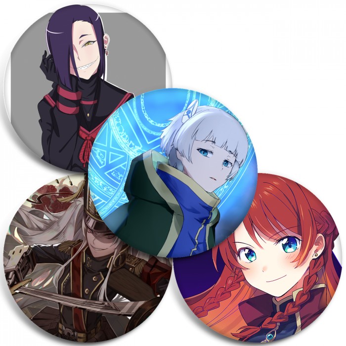 Несколько видов значков с персонажами вселенной Возрождающие.