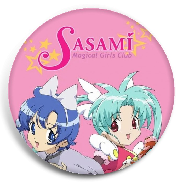 Несколько видов значков с персонажами вселенной Сасами: Клуб девочек-волшебниц.