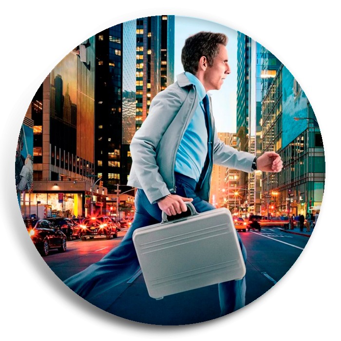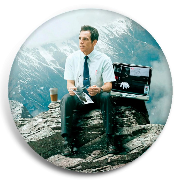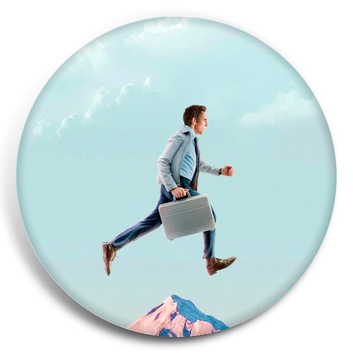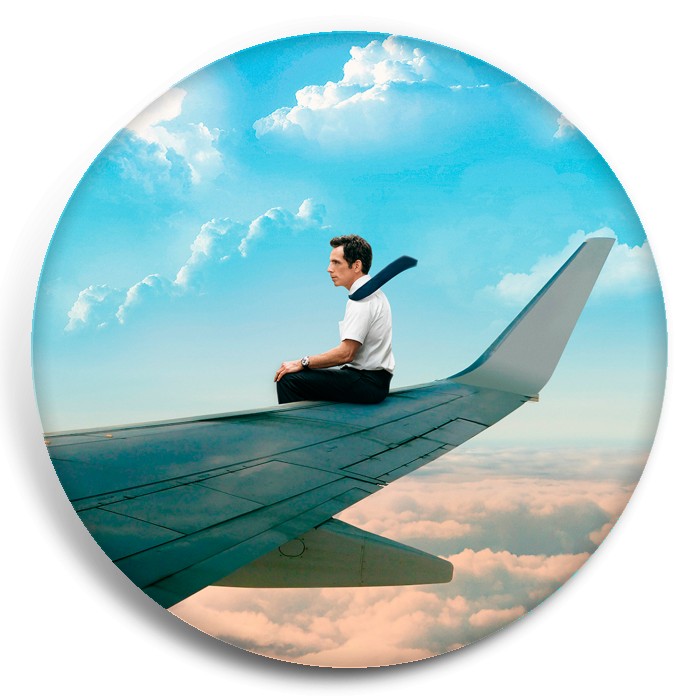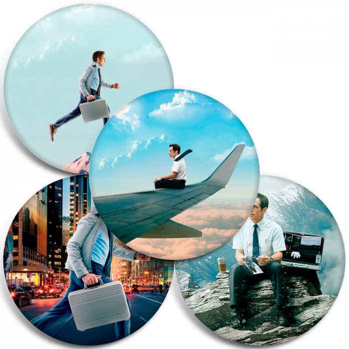 Несколько видов значков с персонажами вселенной Невероятная жизнь Уолтера Митти.