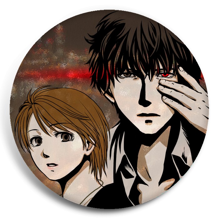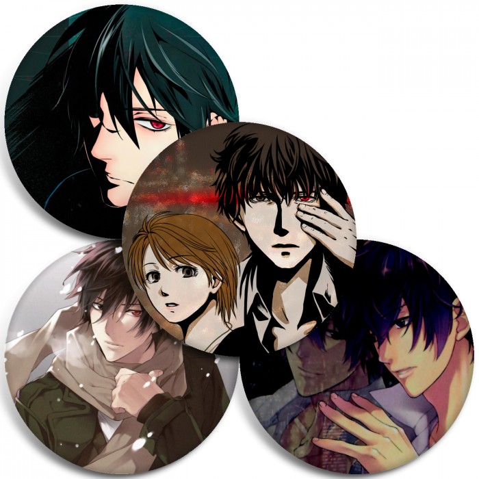 Несколько видов значков с персонажами вселенной Детектив-медиум Якумо.