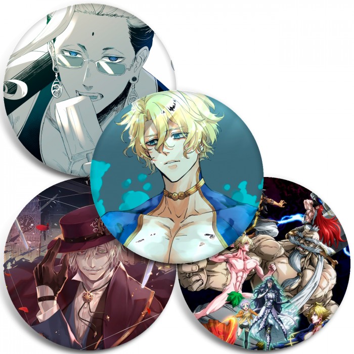 Несколько видов значков с персонажами вселенной Повесть о конце света.