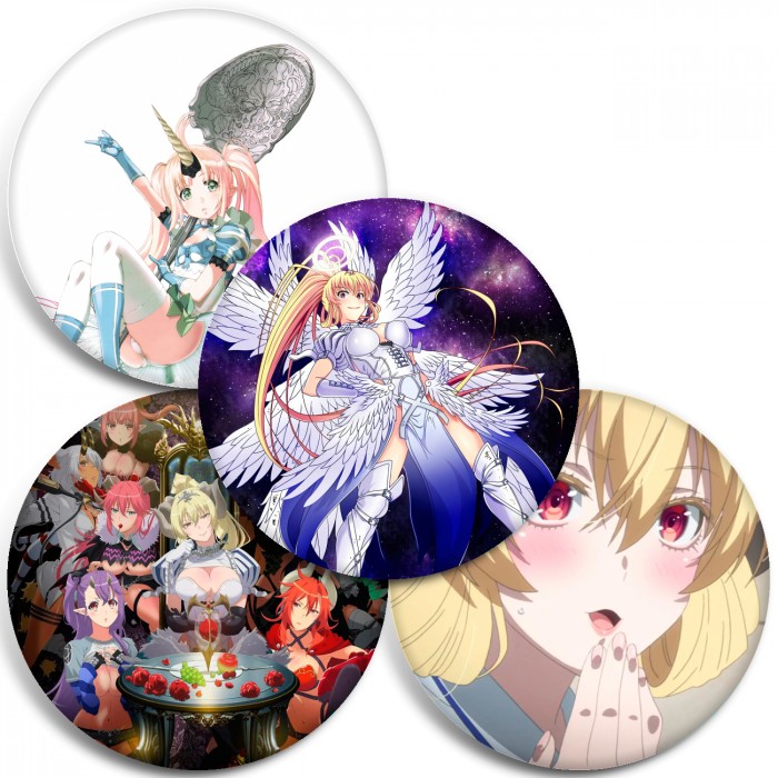 Несколько видов значков с персонажами вселенной Прегрешение: Семь смертных грехов.