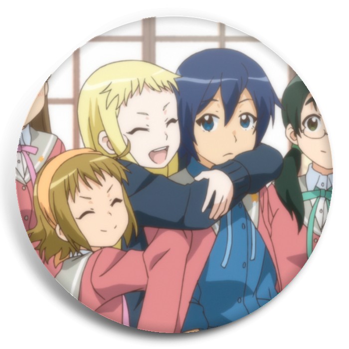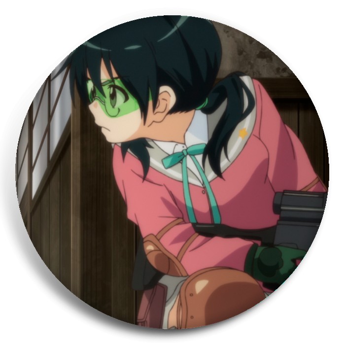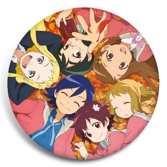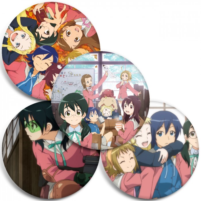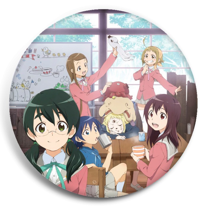 Несколько видов значков с персонажами вселенной Кружок по страйкболу женской гимназии Стелла.