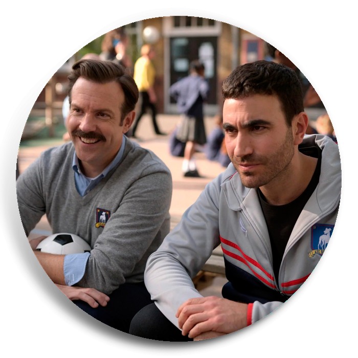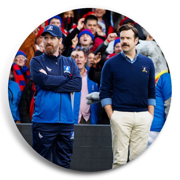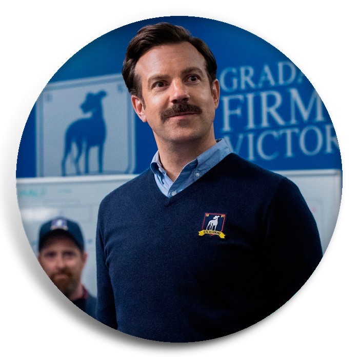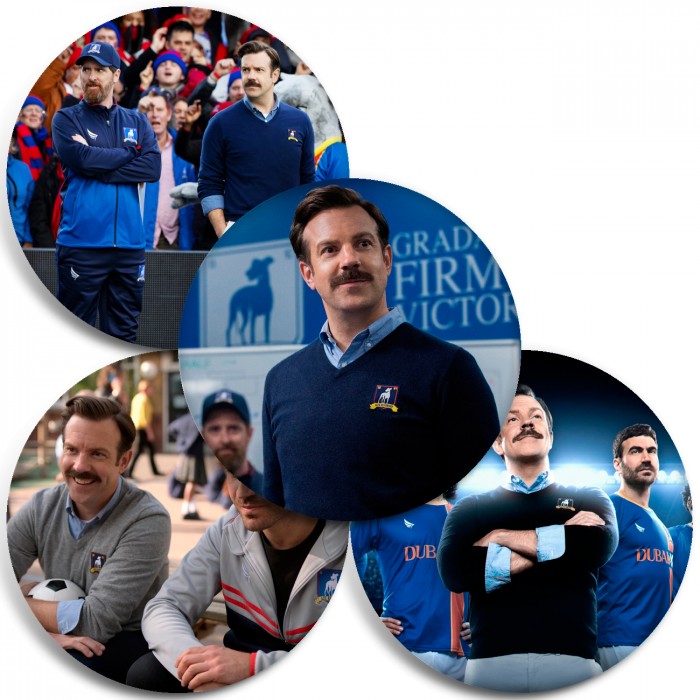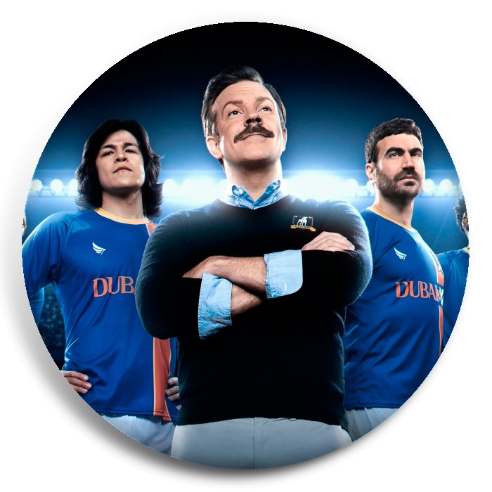 Несколько видов значков с персонажами вселенной Тед Лассо.