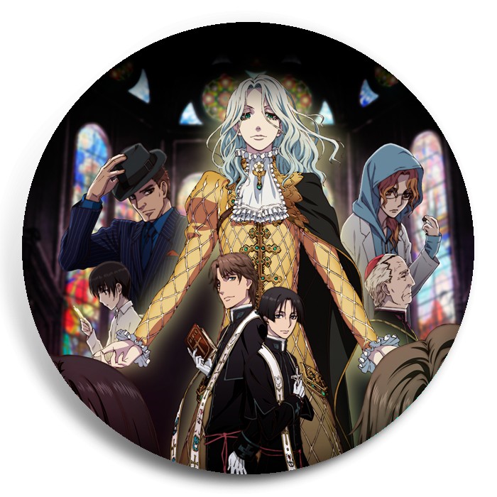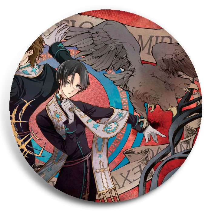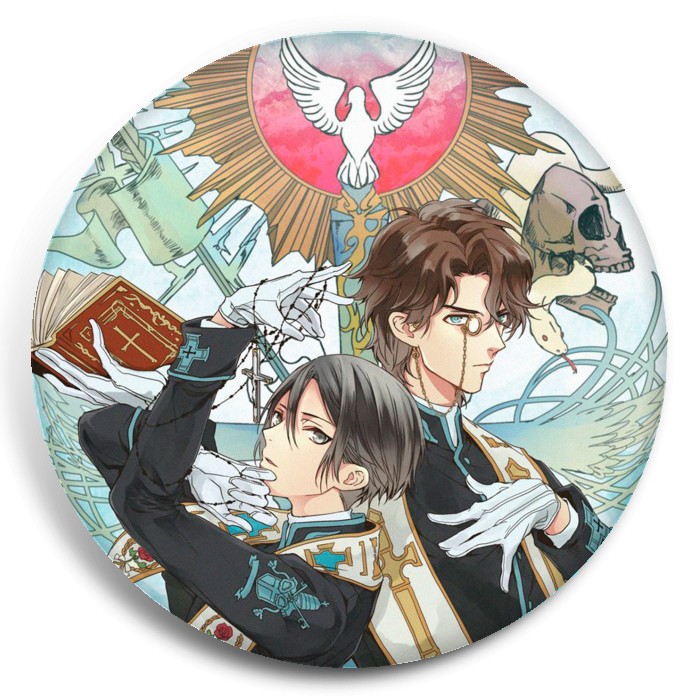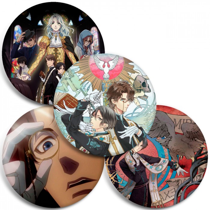 Несколько видов значков с персонажами вселенной Инспекторы чудес Ватикана.