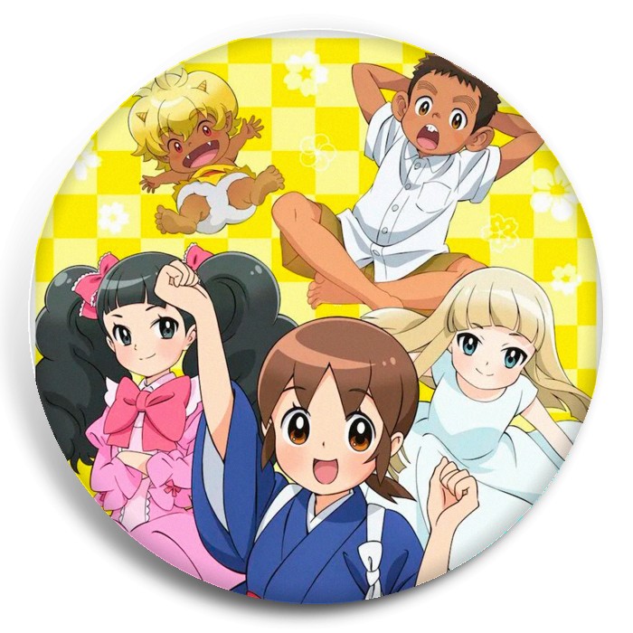Несколько видов значков с персонажами вселенной Гостиница Окко.