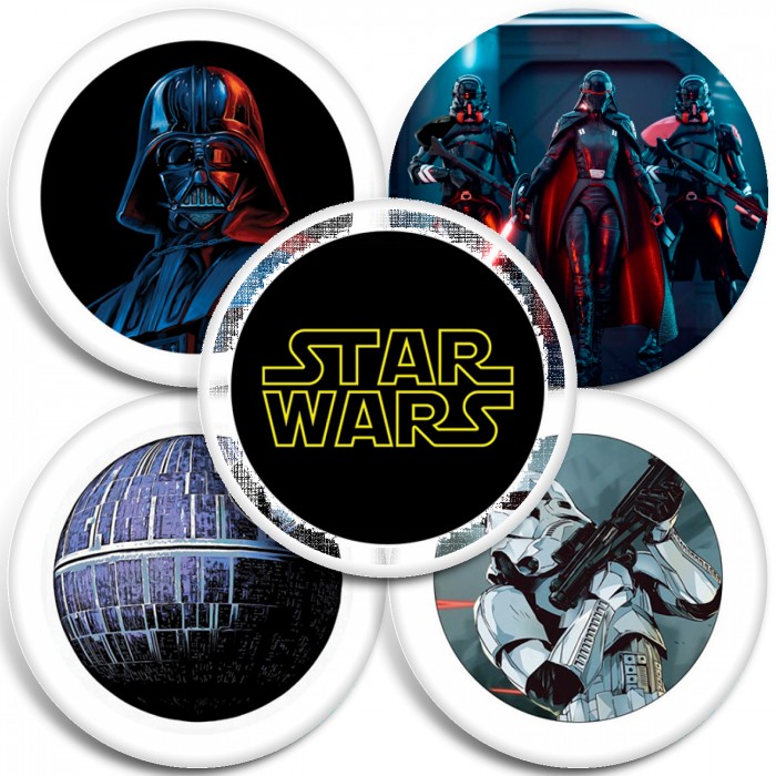 Несколько видов маленьких (25 мм в диаметре) и больших (37 мм) металлических значков с персонажами «Звёздных войн».