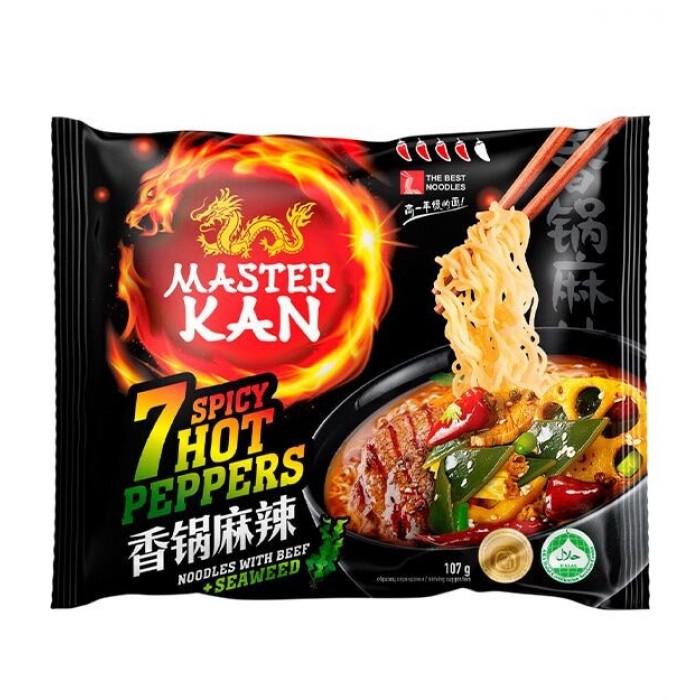 Откройте для себя удивительное сочетание вкусов с лапшой быстрого приготовления Мастер Кан со вкусом 7 перцев и морской капусты!