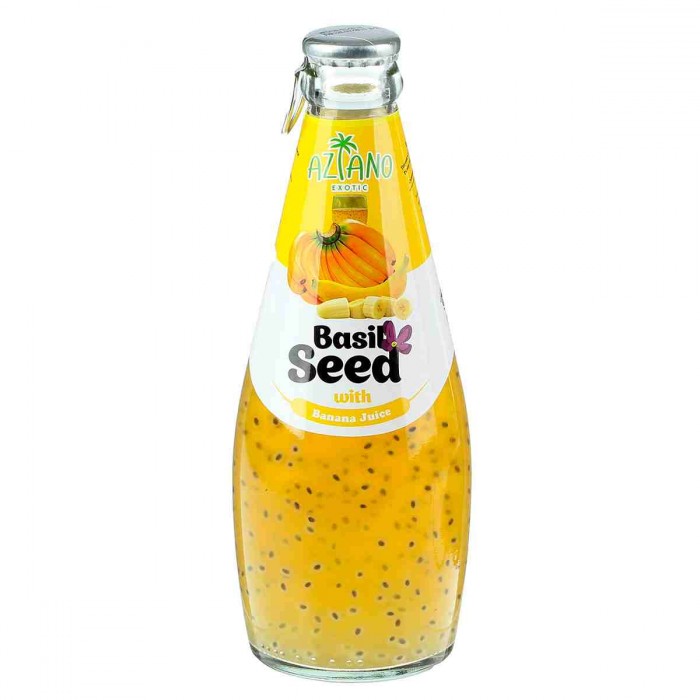 Состав | банановый сок 30%, семена базилика, лимонная кислота, сахар, вода, геллановая камедь, ароматизатор банана, краситель (e102, e110, e150d). Пищевая ценность на 100 г продукта: белки - 0 г, жиры - 0 г, углеводы - 11 г. Энергетическая ценность - 46 кКал. Условия хранения: Хранить в сухом месте, не подвергать воздействию прямых солнечных лучей. |